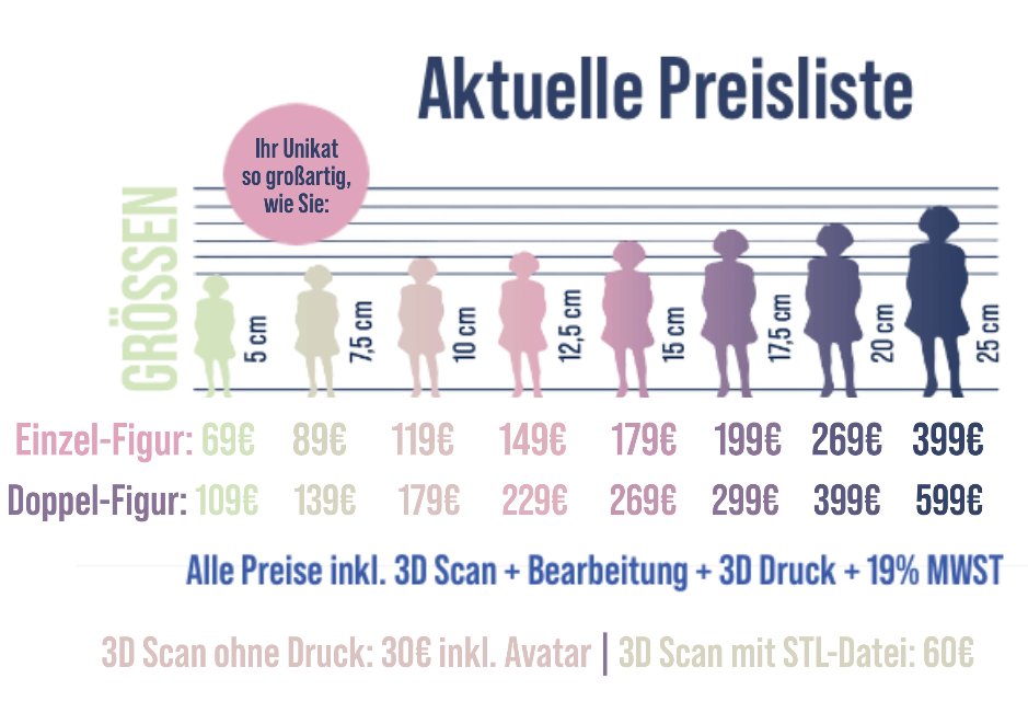 Mit professioneller Technik und dank 105 Kameras erstellen wir einen lebensgetreuen 3D-Avatar in Form einer Figur – und das in weniger als zwei Sekunden. Unser 3D-Scanner ist mobil einsetzbar und gesundheitlich unbedenklich. Das Beste: Am Ende haben Sie eine greifbare Erinnerung, die nicht in einem Album verschwindet und dabei ein echtes Unikat ist.